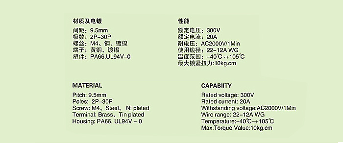 間距:9.5mm;極數(shù):2P-30P;額定電壓/電流:300V/20A